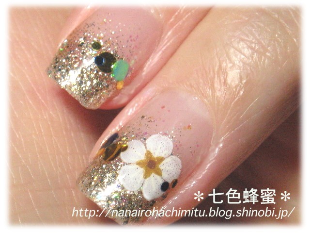 中指は押し花シールと丸ホロをフレンチラインの辺りに並べて、