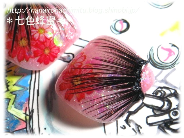 ピンクにラメいっぱいでホロもいっぱいでキラキラなベースにお花を載せて、