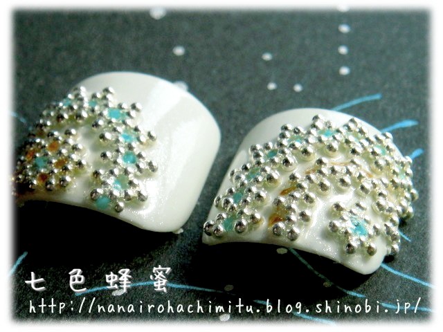 青い所がターコイズ、オレンジ色の所がアンダリュサイトという石を使っています。