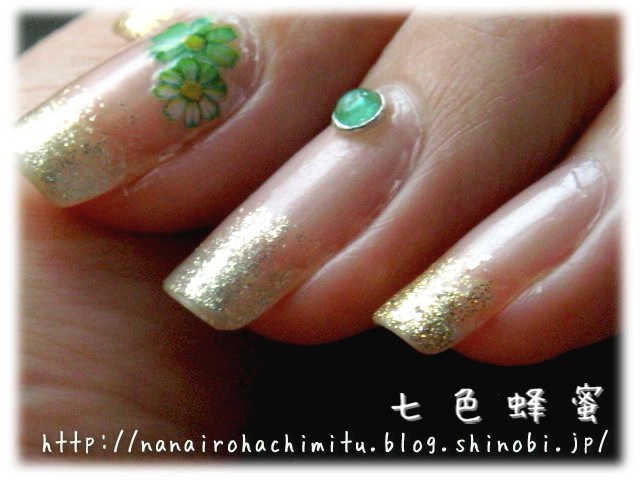 小指、人差し指を、ゴールドラメでそれぞれフリーエッジが隠れる程度までシロップ。