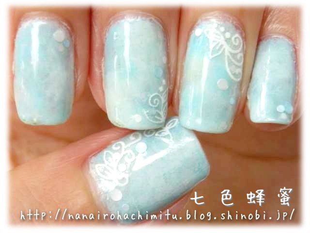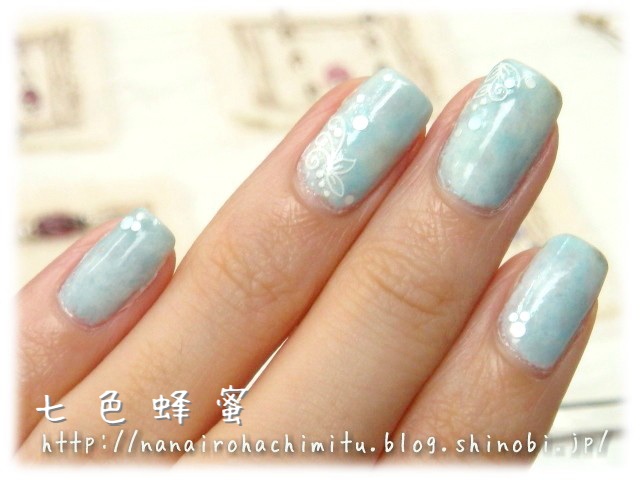 白いロココ調リーフシールと水色と白の丸ホロを散らして、