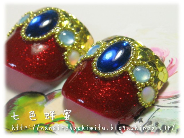 ベースの赤もラメ入りのものにしたのでかなり華やかなデザインになりました。