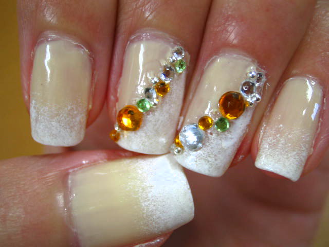 斜めに塗った爪は境目にオレンジとクリアと黄緑のラインストーンを大小と、