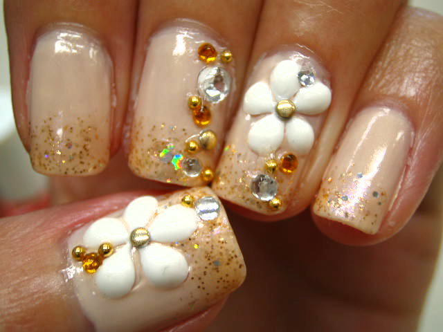 少し大きめの3Dの白い花を載せて中心にゴールドスタッド。