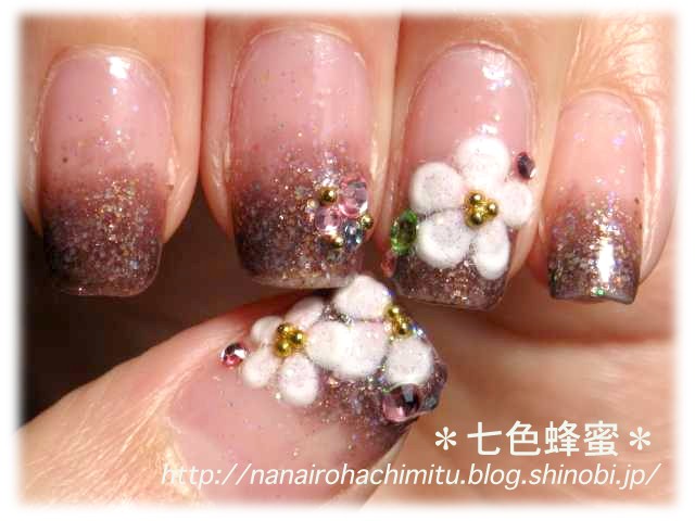 白い花のシールを薬指と親指に貼って、中心にゴールドブリオンを載せて、