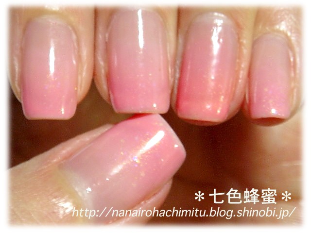 爪先に淡いオレンジ系の微細ラメを塗って、