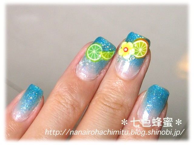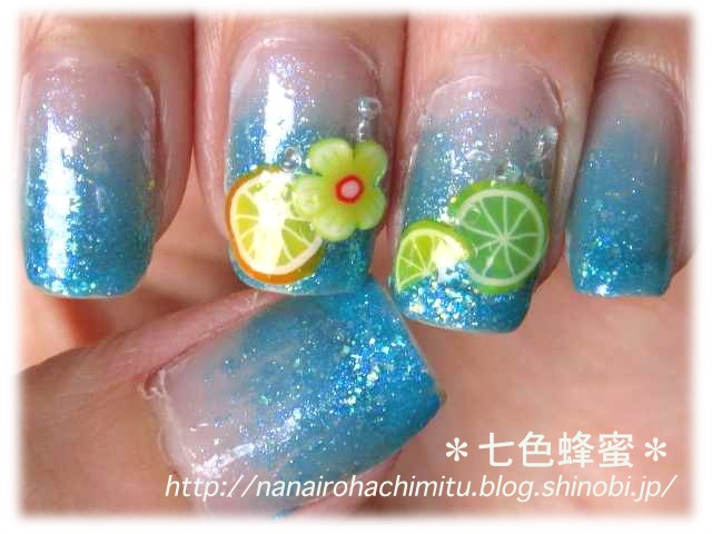 クリアブルーのラメで爪の根本を少し残して全体的にシロップ。