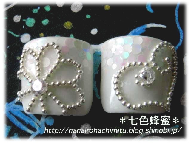 ペディキュアは華やかな方が良いだろうと思ってパステルホワイトの丸ホロをメインにしました。
