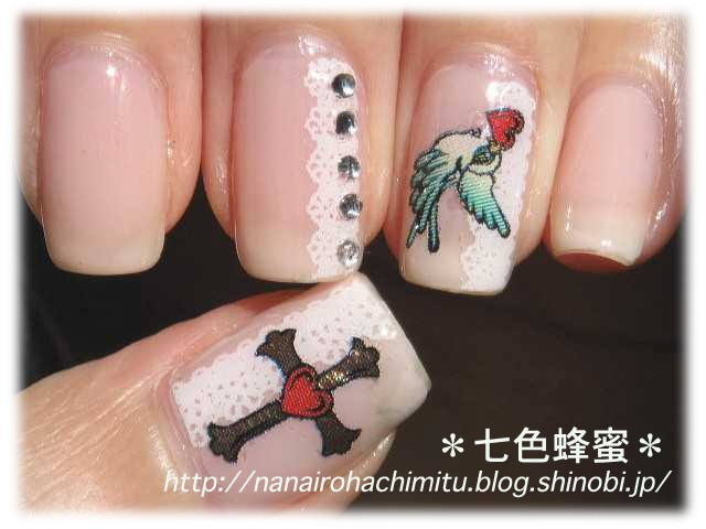 レースシールを縦に貼って、その上から鳥と十字架のシールを貼って、