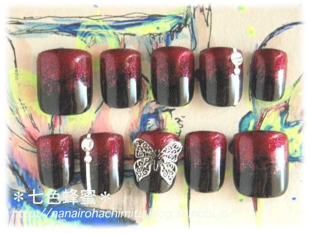 黒ベースに赤ラメでシロップにしてシルバーの蝶々を載せました(^^)。