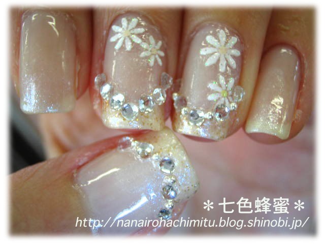 白い花のシールとクリアと水色のラインストーンを斜めのラインで並べて、