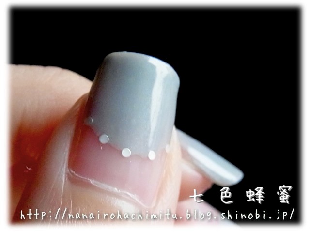 微細パール入りのグレーで深めの丸フレンチになるよう2度塗り。