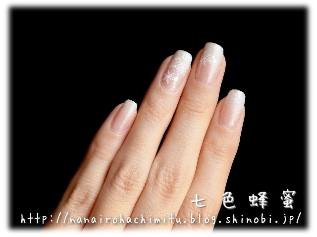 爪先だけ雪の結晶のシールに重ねるようにラメ入りホワイトを軽く塗って、